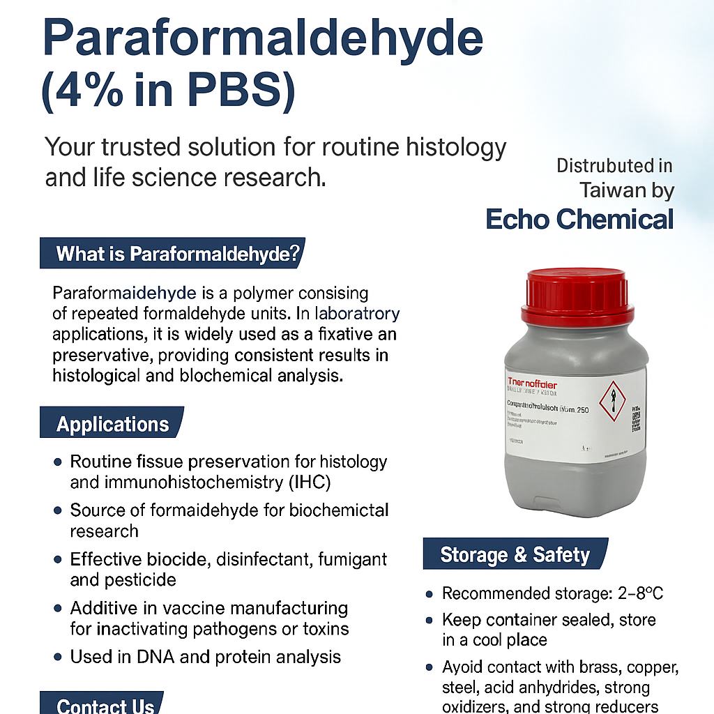在組織學與生命科學研究中,PBS 中 4% 多聚甲醛 是最常用的組織固定溶液之一。景明化工作為 Thermo Scientific™ 在台灣的合作夥伴,為您提供原廠高品質產品,助力實驗室與生技研發。