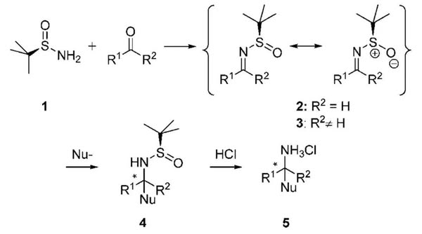 1997 年由 UC Berkeley 的 Jonathan A. Ellman 教授團隊開發,利用手性叔丁基亞磺酰胺 (tert-Butanesulfinamide) 與醛/酮縮合,能高效生成穩定且可大量應用的手性亞胺。