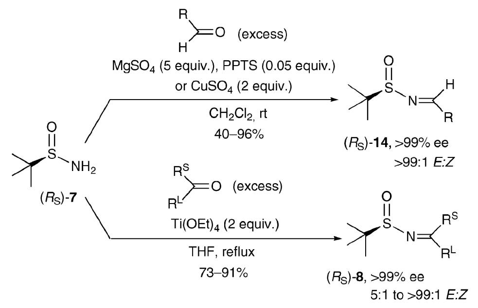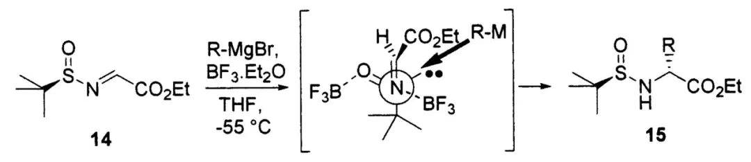 與 有機金屬試劑 (RLi, RMgX) 反應 → 高非對映選擇性胺類。